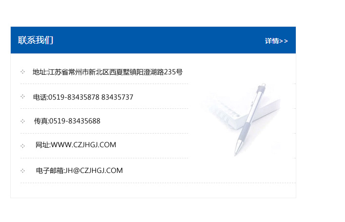 地址:常州市新北區友邦商務大廈1幢16、17層  電話:0519-85101652  傳真:0519-85112595  郵編:213022  網址:www.cz-jiayue_cn.ys12345.com  郵箱:xiajifengaa@163.com